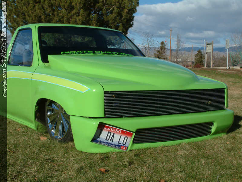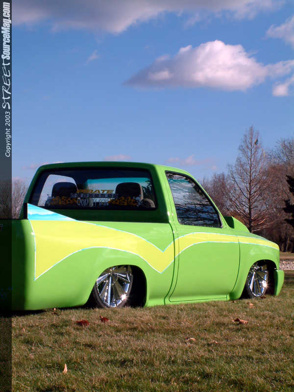 Next, Tony would weld up a Grant Fab tailgate skin housing a frenched in license plate box, once again keeping things smooth. The taillights were removed and replaced by a custom set fabricated by Bob Grant of Grant Fab. Tony from Pirate Customz would be responsible for the bodywork while Matt Stearns would show his block sanding skills.  With every thing ready for paint, it was time to let "Airbrush Chris" of Air Creations, Boise ID, show some skills of his own. The paint of choice for Tony would be a PPG Get'em green with Electric green 2 tone 50's style paint.