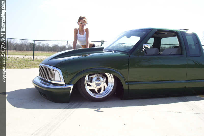 First the door handles, stock mirrors, tailgate handle, taillights and antenna would have to be history. Next the antenna would have be relocated and frenched into the passenger's side of the C pillar. Once all the bodywork was complete Ryan laid down several coats of factory Chevy Fairway Green paint and topped that off with generous amounts of the clear stuff.  With the paint shining it was then time to finish the exterior of the dime. Troy added a 97 Chevy S-10 chrome grill shell with a phantom billet grill hiding the HID conversion headlights neatly behind it.