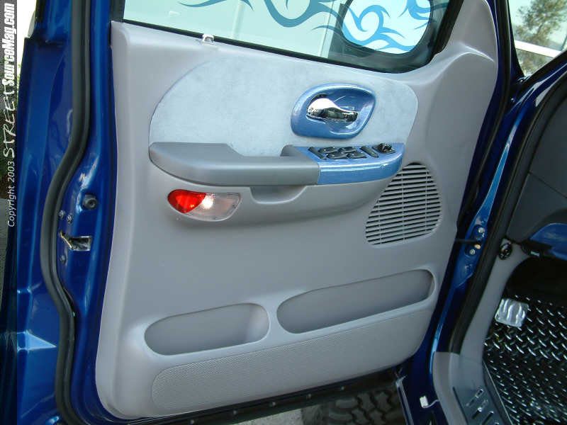 A set of NU-Image platinum gauges would replace the stock set while a Trenz flamed rearview mirror and flamed pedals would also be mounted up. Silver carbon fiber insert material can be found through out, along with the seats, which are found in stock leather but with custom center silver carbon fiber material in the centers. Finishing things off with a nice touch would be a set of Vitek diamond plate floor mats.
