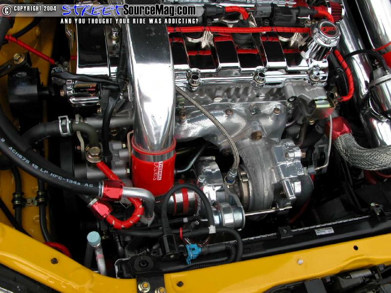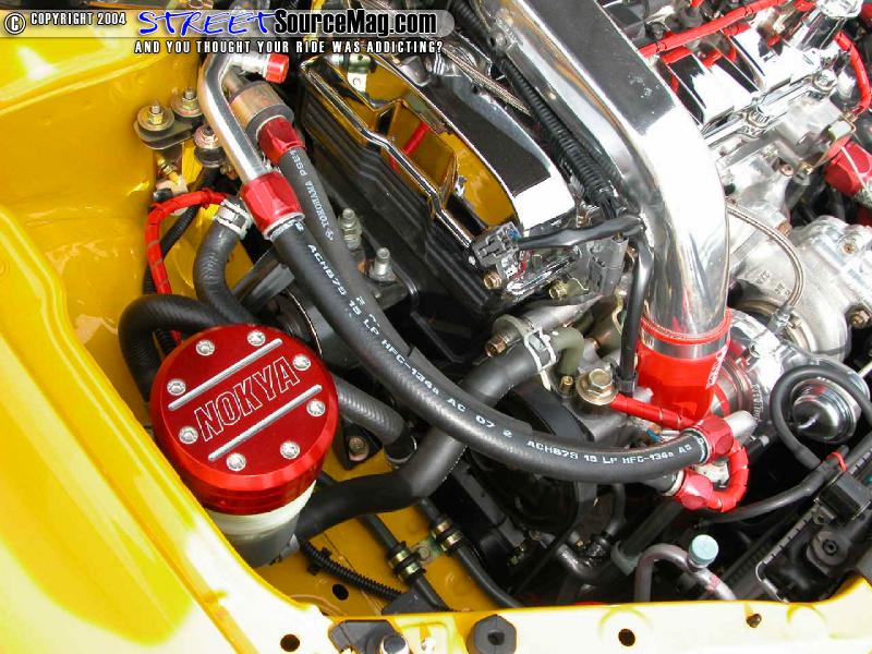 Trick it all up with polished intake pipes, a custom HiBoost turbo manifold polished and ceramic coated by Performance Coatings in Arlington, Texas, steel braided hoses, and an Apex-1 N1 exhaust system. Oh yea, then there's the chrome coolant catch can, the Injen aluminum oil cap, the Top Speed air filter, the MazdaSpeed JDM radiator cap, the chrome strut bar, and the Nokya red engine dress up kit.