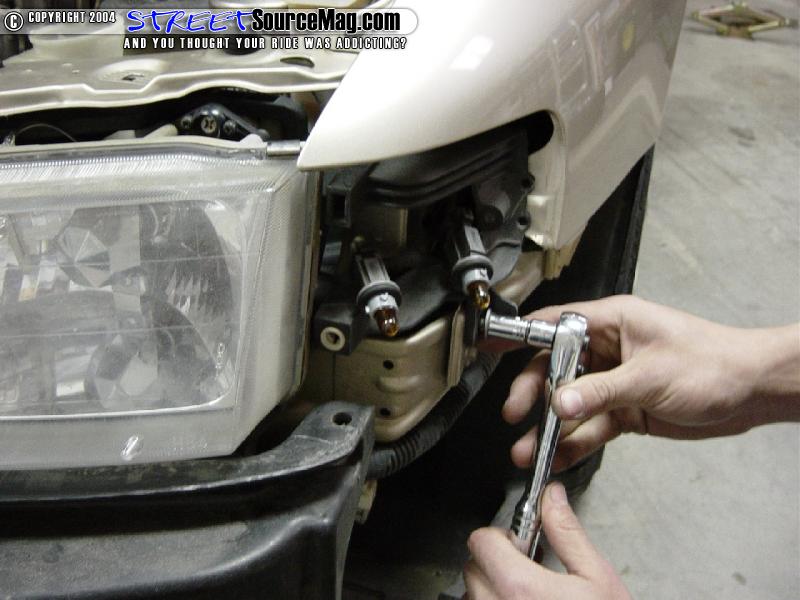 There is also a 10mm bolt on the inner side of each light as well that will need to be removed. Next there is a 10mm bolt under where the corner light went, that will need to be removed. The next bolt is under the headlight towards the outside of the car. It is behind the crush panel. It is also a 10mm bolt and one per light.