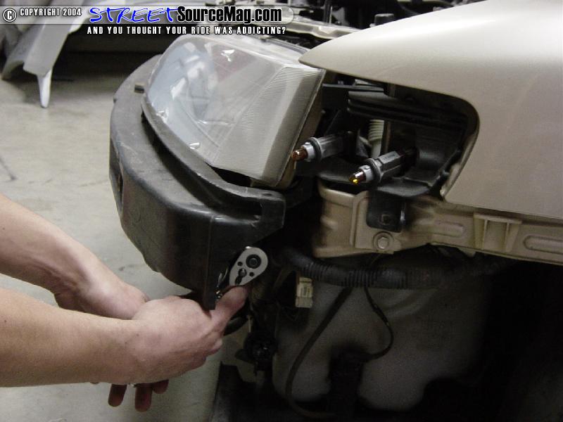 Once the front crush panel is removed, you can simply unplug all the bulbs and pull the factory headlight forward to remove it. This leaves plenty of room for the new light to be installed. This is the comparison of the stock 2-piece set up and the new one-piece set up. Notice how the stock headlight will turn dull after a few years of use; the new lights will also clean up the front end as well. Now that you have removed everything and have both lights out, it is time to reverse all the previous steps and install the new lights. With these particular lights, you will only have 4 bolts to reinstall each light instead of 5. The new lights will simply need to be pushed in with the guide pins where the corner lights used to be and re-bolted. Here is what the final look will be. Something as simple and cheap as changing out your headlights can make all the difference in the world.