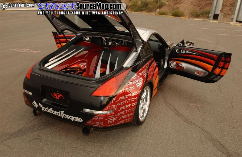 With the exterior modifications complete they would then install an HKS Hypermax LS coil over suspension. The new suspension would allow them to lower the 350Z fenders down to the VOLK GT-C face II 19x9.5 inch wheels found in the back while the front is found to have 19x8.5 bolted up. The wheels would be wrapped with Bridgestone Potenza 275/30's out back and 245/35 upfront.