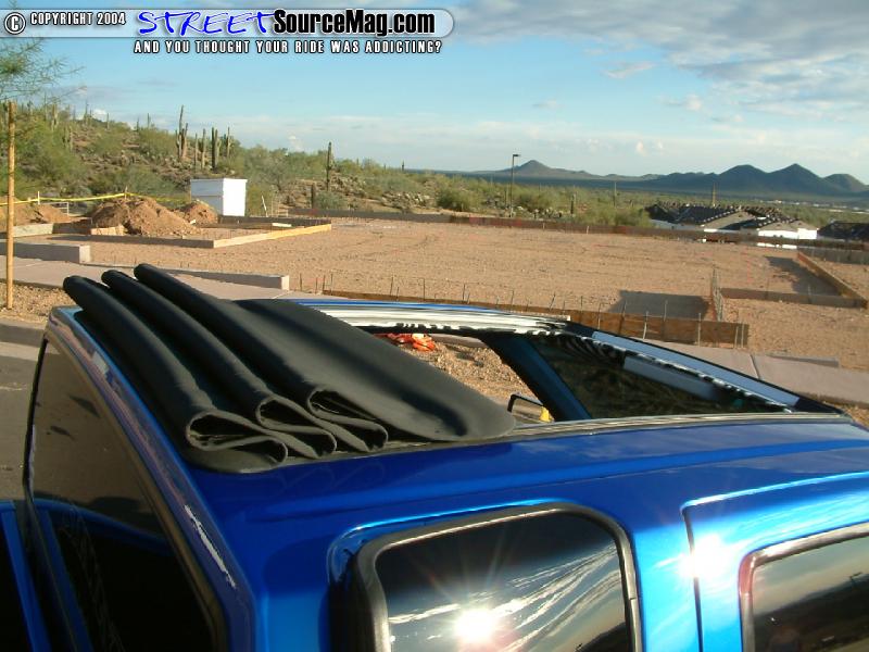 Continuing the body mods, the 3rd brake light, tailgate handle, emblems, squirters and cowl would all be shaved while the rear license plate would be frenched into place. Finishing off the exterior mods Jerry would install a 35x42 electric sliding rag.