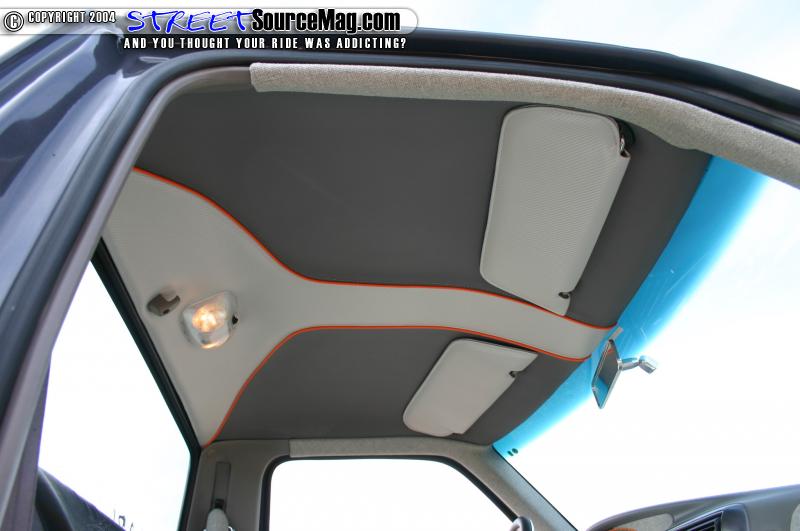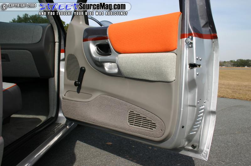 The seats were custom fabricated by Ken. What he did was create a custom low back seat with the top half being Escort seats, and the bottom half being Ranger seats. The seats where then wrapped by Larry’s Trim in carbon fiber silver, gator shine leather, gray vinyl, and finished off with orange piping. The steering wheel was replaced with a Billet Specialties billet wheel, and the mirror was replaced with a billet-milled mirror. A Kenwood head unit, Rockford Fostgate subs, and Blaupunkt mids and tweets provide the sound. Audiobahn and Blaupunkt amps power the system.