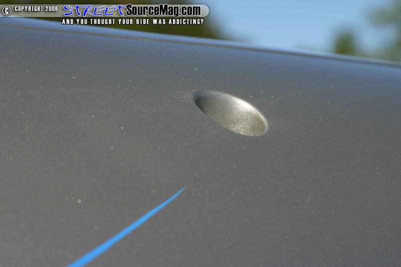 The antenna was replaced with a frenched antenna. The stock side skirts were then molded to the car to give them a custom appearance, the car was then rolled into the paint both and sprayed with a few coats of PPG Silver accented with HOK tribal burgundy flames. Todd Fisher completed the paint and clear stage then striped the tribal flames with Electric Blue oneshot paint.