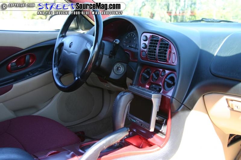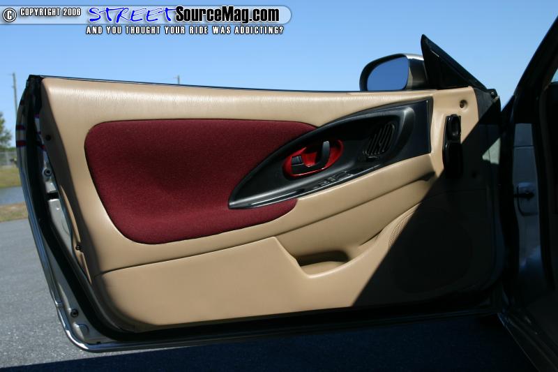 The seats were wrapped in tan leather and burgundy tweed to flow with the rest of the interior. Scrape-N-Customs set Fleet up with the Clarion 7” TV, Audiobahn speakers, and PBX 12” subs. These where all powered by Audiobahn amps. The subs and amps were fit into a custom fiberglass box built into the trunk of Fleets Sebring.