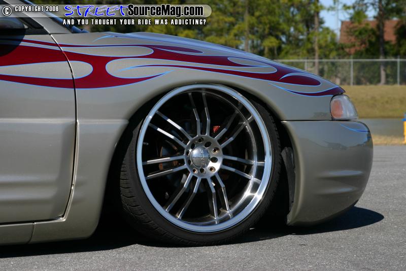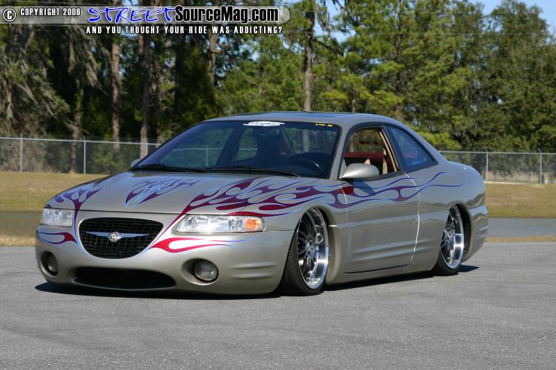 Fleet’s Sebring wouldn’t get very far at any show with its stock stance so a 2 pump Showtime hydro setup was installed with 4 accumulators, 10 switch’s, and 4 yellow top battery’s. All of the hydro lines were hard lined. To get the car to lay a little lower the front spindles were shortened, custom upper and lower control arms were built for the rear, and Toyota spindles were installed in the rear.