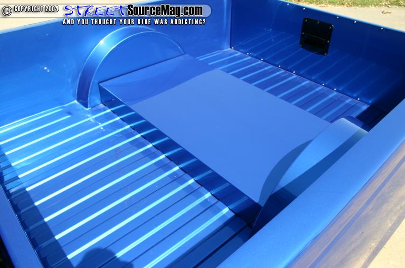 Next Justin and David Larson started the extensive bodywork around the truck by shaving the door handles, molding in an AIM role pan, shaving the tail lights and installing LED lights across either side of the rear, shaving the tailgate handle, and moving back to the front the antenna was shaved off for a cleaner look. The truck was also fitted with tubbed fenders up front and a bridge cover in the bed of the truck. All said and done the truck was looking pretty badass but Justin knew he was still not finished.