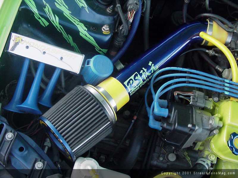To give the engine bay some added eye-candy, Tony has many items painted; cleaned up along with a blue anodized oil cap cover. Also for added looks and performance, an Akimoto cold air intake had been installed. To help the Honda engine breath, a fully polished exhaust along with a "Racer Design" Catback had been installed.