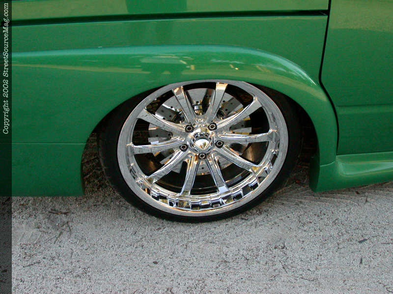 To bring vision out during the night, a set of PIAA lights mounted into the front bumper would help the stock headlight assembly. With the bodywork and new panels added and complete, it was time for Ernest to have the crew at Liberty Body Shop of Los Angeles to lay down the paint of chose. Utilizing BASF (RM) paint, the Van would be painted a 3AM green along with a set of ghost flames to help bring things alive. With the exterior complete it was time to work the suspension. With running a set of 20x8.5 Weld Racing Evo Axis 5 wheels wrapped in 245-35-20 Toyo Tire Proxes, it would take a nice suspension set up to bring the body kit down closer to the ground. Starting in the rear, the frame rails would be notched and boxed by Sport Truck Specialty of Carson, CA, leaving more room for rear travel.