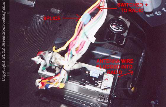 Step 18 Now I tried sticking my arm up the dash to run the new antenna wire, but there is just way too much crap in there. A much easier thing to do is to "fish" the wire up. This is accomplished by laying the old OE wire on top of the new antenna wire, and taping them securly together. Now pull the old wire up out of the dash, and while your doing that, the new wire comes with it. Wow! Aren't we glad we didn't pull it out earlier. And the new wire runs exactly the same way the old wire ran, so there should be no interference with anything. Step 19 Now that the new wire is where we want it to be, it needs to be connected. The new antenna wire has a positive lead that should be connected to a switched on source, because the hidden antenna has a built in amplifier. I connected it to the switched on source for the radio with a squeeze together "T" splice, and plugged the antenna into it's jack.