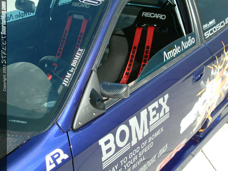 Once the car was striped of the masking tape and buffed to a high gloss, TG Graphics applied Bomex JDM Graphics to the car. To add to the exterior attire a Corvis Aluminum wing and APR Formula 3 carbon fiber mirrors were installed. To ensure proper lighting at night a set of Phillips HID conversions were installed.