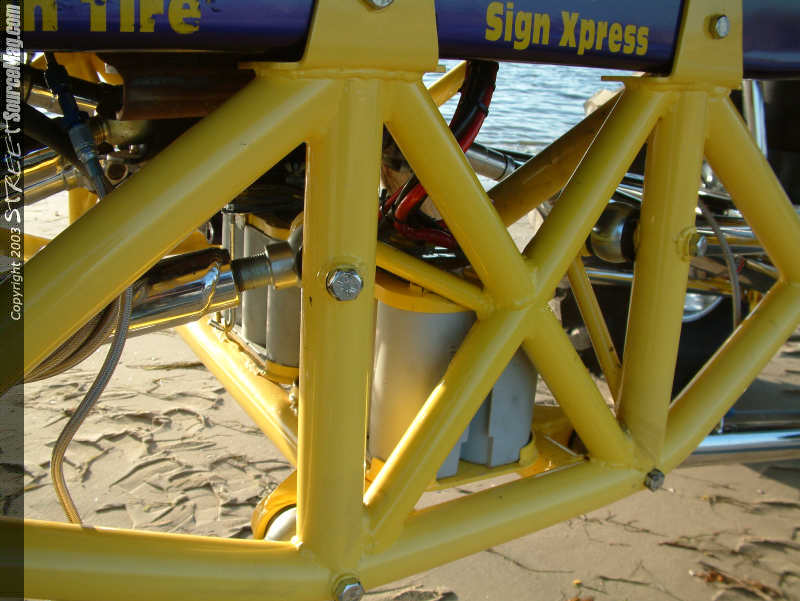 The cage also provides the mounting locations for the chrome-plated "The Edge" Donahoe Racing Enterprises link bars with 1-ΒΌ heim joints. The front is equipped with a triangulated four-link and the rear is fitted with a triangulated two-link system. There was even enough room left over for the 4 Optima yellow top batteries to straddle the transfer case.