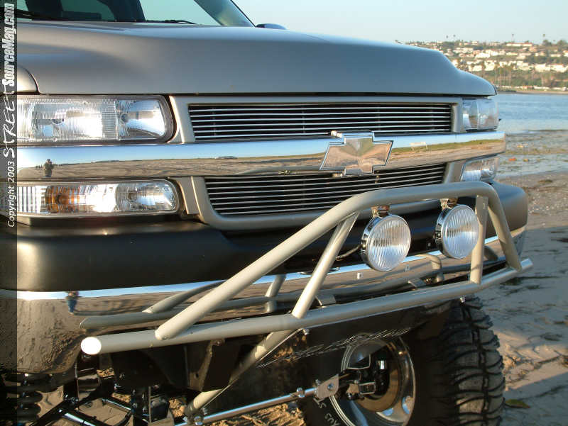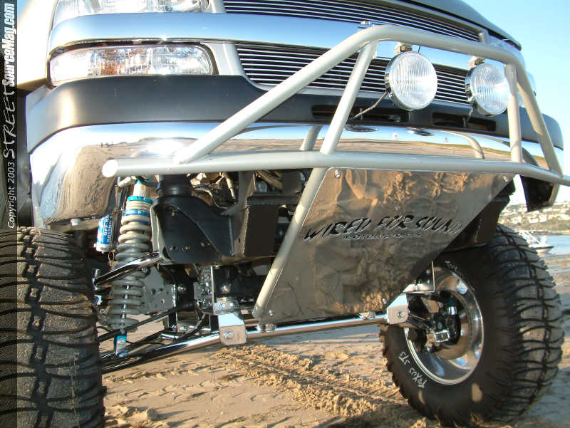 With purchasing his all new Chevy 2599 HD for $32,000 back on April 11th of 2001 along with dishing out another $50,000 into the build up, it would take 1 year to build and would be found complete on June 15th of 2002. The reason Adam decided to build this ride was as a shop vehicle showing off their skills. Adam has previously built an 85 Blazer and a '84 1500 but felt that this would be his pride. After became involved in the scene when he opened up his shop 12 years ago, the skills are found better as the years go on. Adam's decision to keep things simple would pay off. Starting upfront a Billet Stoll grille would be installed along with Pewter painted brush guard and chromed out cover. In the guard you will find a set of lights mounted up for those late night 4x4 adventures. Next the stock front fenders would be thrown to the side and a set of Glass Works Fiber fenders, with a Pre-runner look would be bolted in their place. The stock door handles would then be removed and a set off of an Escalade would be found bolted in along with a set of 2003 Chevy taillights in the rear.  | Everything with this truck is very clean, not even a spot of dirt in the wheel wells! |