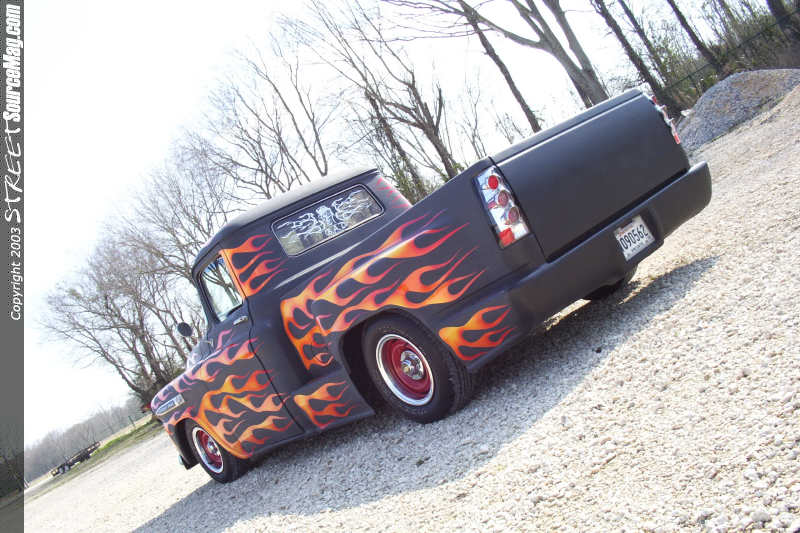 Billy started the project by finding the cab and front clip of a completely wore out 59' Apache. Ok so I know your asking why only the cab and clip. Well if you'll hold your horses I'll tell yeah. See Billy only needed the cab and front clip because that was all he planned to use of it. Billy took the frame, motor, suspension, bed and part of the interior of a 1988 Chevy ½ ton donor truck to use in a perfect mix with the 59's cab and front clip. Billy took the 59' cab and placed it on the 88' frame reworking the cab mounts to accept the Apache cab. Once the cab was firmly set on its new foundation it was then time to move attentions to the rear of the truck. Billy once again pulled out all the stops and added an 88' Chevy step-side bed, but to make sure that the bed fit correctly it was turned over to the fiberglass skills of Tim Dupre of Houma, La. Tim cut, sectioned, shaped and reworked the bed until it fit perfectly behind the 59' cab. While Tim had his tools out he shaved the tailgate handle and molded in a new rollpan. Once the bed was permantly in place a set of 88' Altezza Euro clear taillights were then temporarily installed in the factory location to give it a new flair. To add style to the cab Tim shaved the vent glasses of the cab to loose the Farmer Brown look. Once the body was straight Billy knew it would be awhile before he was ready to lay down the final paint scheme so Billy asked Tim to prime the truck flat black.