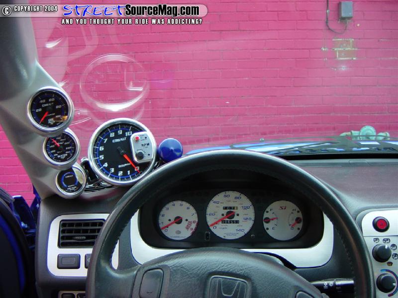 The list of gauges is as follows; tach, air/fuel ratio, water temperature, oil pressure, boost and vacuum. He also put in reverse indiglo gauge faces on the stock gauges to match all the auxiliary ones he added.  To help stiffen the mid section of the car, an Aerospeed lower rear interior brace was added across the rear floorboard.