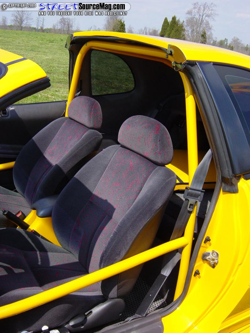 With an exterior like that, it was necessary to have an interior that wouldn't look out of place. Brandon pulled out the dash, center console and tops of the door panels and sanded them down smooth and sprayed the same yellow with gold pearl paint as the exterior.  He also had matching ghost flames sprayed on the top of the dash. Now for what makes this interior stand out is the full frame-to-frame roll bar.