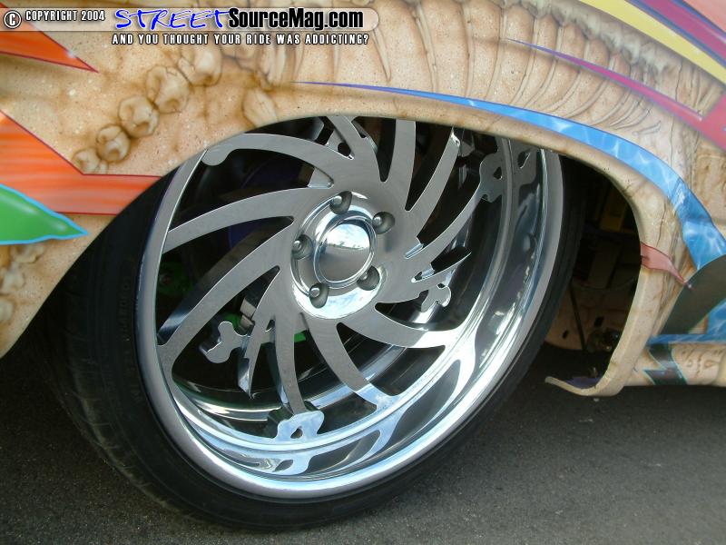 The battery would also need to be moved under the bed and in the place of the stock battery Charles would install 2 Stinger batteries. With the new drop many items would be moved and reworked to fit the new 18-inch B.A.D. Bone yard billet wheels wrapped in Nitto tires while the rear would be tubbed to fit the 20x8-1/2 wrapped in 255-35 Nitto tires.   Behind the wheels you will also find a custom slotted disk brake kit from Downey Off-Road and the fluid finds its way via the newfound stainless brake lines.