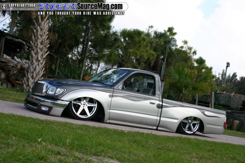 For ups, Firestone 2500 bags would be installed at all 4 corners. Not yet low enough for Tony's taste, Shaune would then need to move the master cylinder up a bit and relocate the battery into the bed for the 4-inch body drop. The firewall would then be tubbed to allow more room for the 19's. After layin' rocker this beast still has A/C, which is a necessity for every day driving in Florida. Finishing the bed set up and suspension, a molded notch cover with RAW logo would be added and sprayed over by a Linex spray-on system.