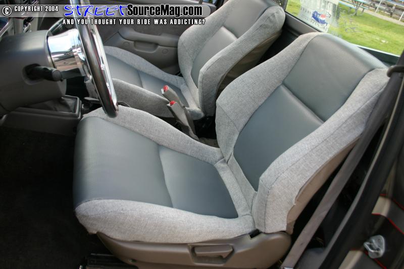 Keeping the clean look with no tinted windows would mean the interior had to leave upto the rest of the build up. Getting things started the dash would be painted to match the exterior while the headliner and other panels would be wrapped in Tweed.   A new set of Acura Integra seats would then be stitched up with gray tweed and dark gray vinyl by Tony's mom and then installed. A Budnik Fomosa steering wheel would then be installed with the half wrap painted to match the exterior and dash.