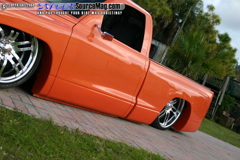 Taking on the sides, the emblems, door handles and antenna would all be shaved while the gas filler door was relocated into the bed. The taillights would be junked and a set of 2004 Dodge Ram tails would be fitted in their place. The mirrors would be shaved and replaced with a flamed chopper style mirror to help finish off the side work.