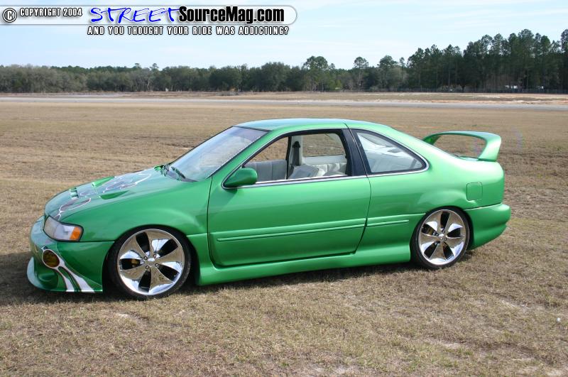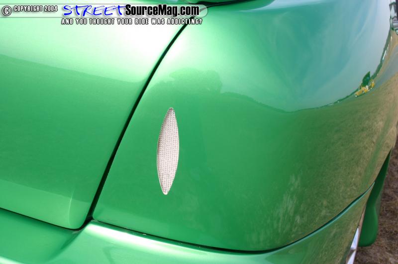 Along with the shaving Rob decided to do away with the antenna, and license plate and to french the license plate. Next a set of Lamborghini style hinges where installed, as well as a flip-flop trunk kit, and clamshell hood. Next Mad Mods would lay down the Electric Lime green custom paint, and then set it off with custom tribal and airbrush work. With all that work done to the body, Rob was now ready to send his car in for some stitching.