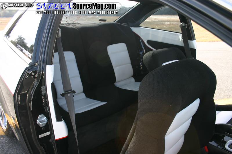 The headliner was fitted with black tweed, while an APC steering wheel was bolted up. The seats where capped off and wrapped in black tweed and white vinyl. The upholstery was done by Albany Auto Trim.