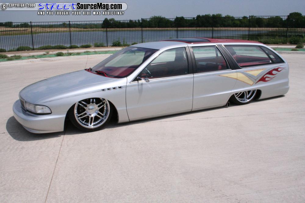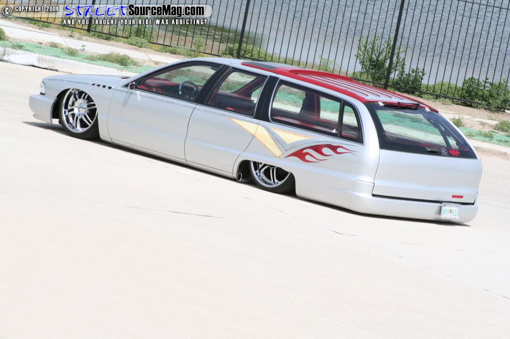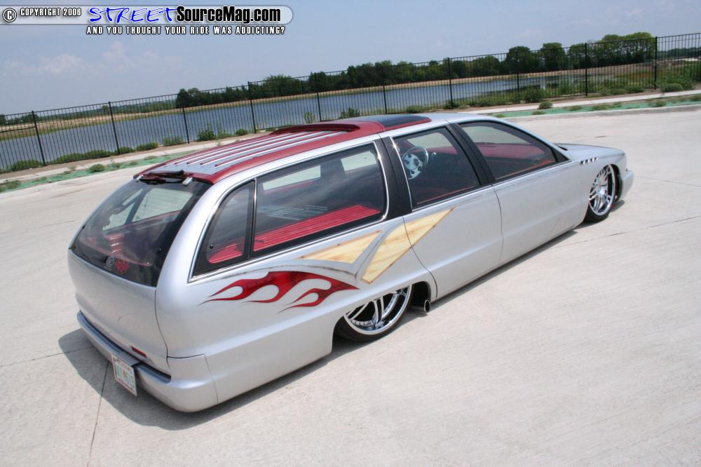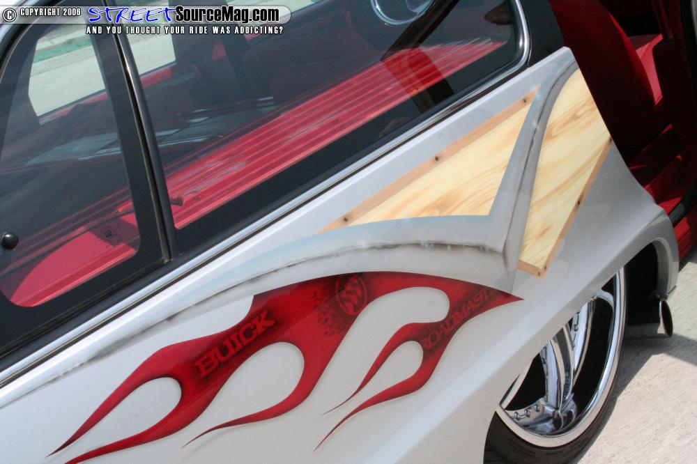 The paint was laid down after all of the body mods were completed as a solid base coat. After the base was done the only part of the build not performed by Ryan was next, the airbrush work. Wood grain was added by Chris Greene to keep the original Roadmaster feel, also added in were the Buick logo and the name “Roadmaster” on both sides mirrored to perfection.