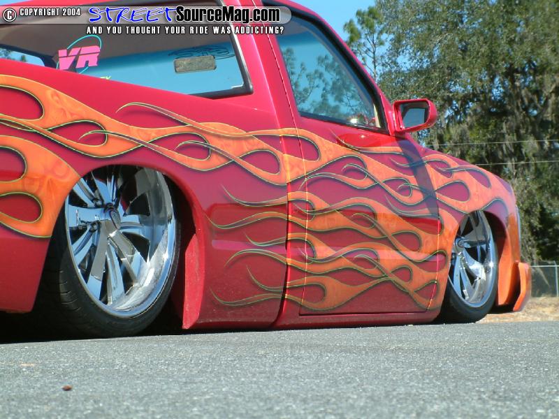 four RS-72 Slam Specialty bags, 8 nickel plated GC Valves, 2 VIAIR 450’s filling the air tank which would be the frame holding up to 7 gallons. Stainless steel airline would then be ran throughout. Not yet finished they would then build a custom cross-member for the air ride housing an “SNC” flush molded with an orange lens and then striped in HOK lime green as well as the logo being a light. With the suspension in place the S10 would now tuck the 20x8.5 Chrome Boyd Coddington Turbines with 245/35R20 Nitto tires.
