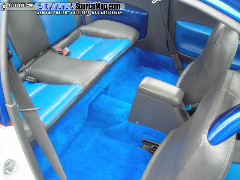 One of the first stops for this Civic was Garrett Upholstery in Van Buren. There the seats were recovered in blue & gray marine vinyl. The door panels and rear deck were also covered to match. Some blue matching carpet was then laid down and Steve Rogers of S&L Body Shop made some final touches with his spray gun. Some of the accessories added were an Indiglo blue gauge overlay, billet rearview mirror, billet window cranks & flamed Inferno billet steering wheel from B.A.D.