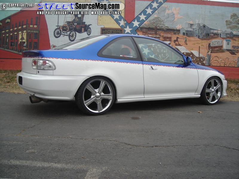 After several days of prep work by Tim and his partner, Steve Rogers was brought in to spray the Pontiac G6 blue and Honda white two-tone paint. Tim then broke up the colors by adding orange tribal graphics between the colors. Once all the paint and buff work was done, the exterior was finished with a sunroof, cat-eye style headlights and altezza taillights.