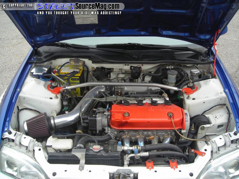 Not wanting to leave anything untouched, the engine bay also received some custom touches. A chrome cold air intake feeds the motor and Eagle rods and pistons were installed along with ARP head studs. A Pro 1 4-to-1 header feeds all the exhaust to a 4” OBX muffler for a nice deep tone. Then the valve cover and other assorted items were sent in to get some orange powder coat. Tim also added several custom stainless accessories. The front chassis was stiffened with a brushed finish strut bar and Pro 1 rear drop coils were installed to level the stance.