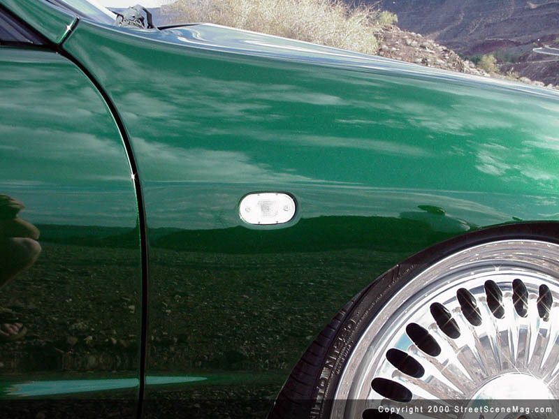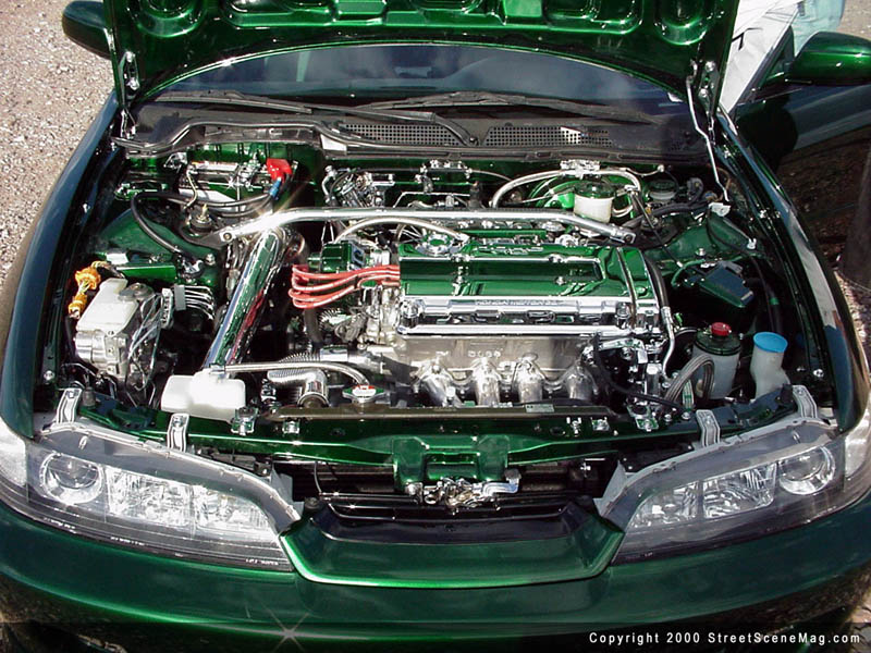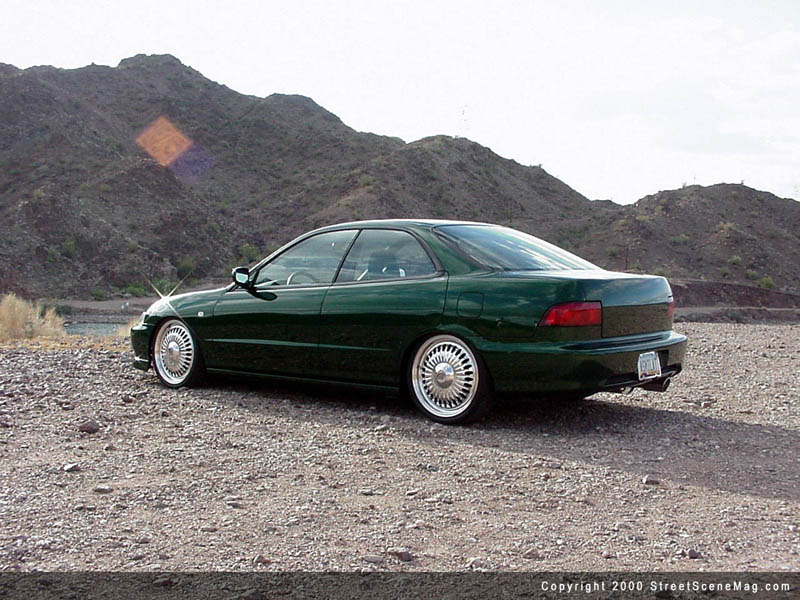 At first, Brian was going to go overboard and have a tube frame made along with air bags. He even went as far as getting a time booked with a shop from Cali to get it all done. But after his car kept getting off back because of the conflicting schedules, it gave Brian the opportunity to weigh out his options. So, the search began for a painter. Brian talked to several shops and even had a little work done by an independent guy out of his house. But a final decision was for the crew from Iron Art Industries in Glendale Arizona to handle the exterior. Chris "McGyver" Jannasch, a friend of Brian's who worked as a Honda tech and now works for SRD as head mechanic, was there helping with the entire project. They call him McGyver because he can do anything and always manages to pull some crazy shit out of his ass. The first thing that was done was to strip the car down to a rolling unibody. With nothing in the engine bay, no interior or windows, Brian's Integra was off at Iron Art in Glendale, AZ. They know their shit and did their best to keep Brian happy through the whole "ordeal". Iron Art first smoothed out the curves of the body. They shaved the handles, moldings, front license plate box, third brake light, emblems, trunk key hole, inner taillights and antenna. The rear window defroster now works as the antenna. Iron Art also mounted the side markers flush in the stock location to add the finishing touches. Now completely shaved, it was time to spray the House Of Kolor Organic Green paint. The project was not the smoothest, but Iron Art busted ass and the exterior came out beautiful.