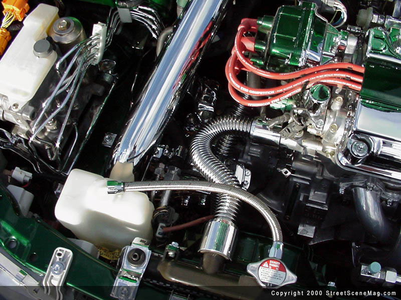 While the car was at Iron Art, the engine and interior were treated to the same level of attention as the exterior. He had always planned on doing some chrome under the hood. Then one day while working in the garage, he was noticing several engine parts laying around on the floor. He decided it was now or never for the chromed out engine bay, and since the engine was already out of the car, now would be the perfect time. So the next step was to pull out the camera and catalogue every thing that could be dipped. After getting it all in order, he took it all to Pete’s Custom Metals to be plated and polished. Once he got his parts back and his engine put back together, Brian's engine was now shiny enough to get the sneak peaks of the girls who are bending over to check things out!