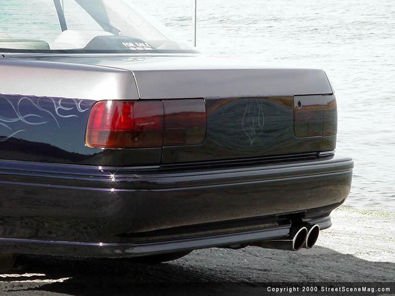 The license plate box in the trunk lid along with the license plate holes in the front bumper were next and the molding followed suit. Troy, always looking for the one-off idea, decided to custom mold the front grille and add his own personal touch. Other notable bodywork is shaved hood squirters, antenna, and the seams under the smoked taillights. Troy himself performed all of the bodywork. After removing the car of all unnecessary items, it was time to apply the paint. To do this, Troy went to Ray Bice of Glamour Works in St. George, Utah for help.