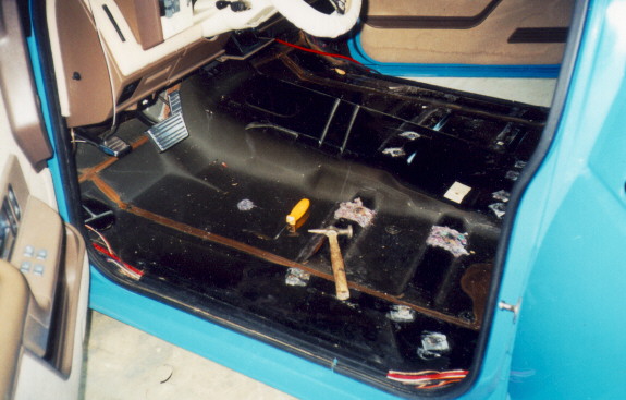 Before The first thing to be done is the removal of all interior peices. While eric is busy laying out the cut lines for the floor, matt starts in with the removal of the front wheelwells, factory air filter box, battery,and windshield washer container.