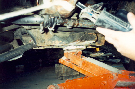 After the interior is all removed, the next thing to do is the frame horns. The frame horns are marked and cut off with the bumper & valance still attached. here, you can see eric using a reciprocating saw to make some really neat cuts, that won't need any grinding before welding. A plasma cutter could be used, but wouldn't do the job as cleanly.