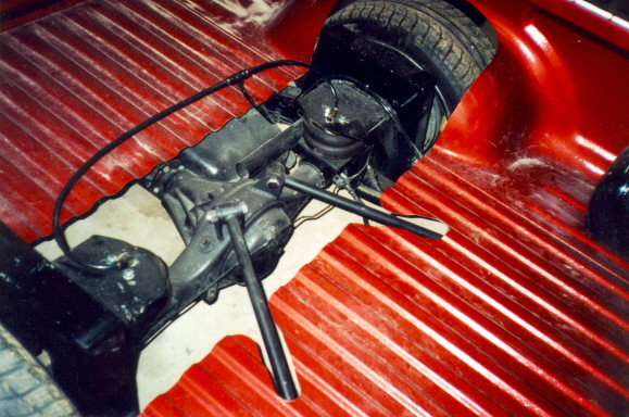 If you're satisfied with everything, put some really good tacks on every weld location and move the rearend through it's entire range of travel. Check for any binding and also the pinion angle. If any adjustments are needed, do them now and double check everything BEFORE you completely weld it up. Remove the bars and weld all the mounts, then add a coat of paint. When everything has cooled, reinstall the bars and the bags. Lastly, put the bed back on and trim the floor if necessary. The truck we used is a 1993 toyota reg-cab owned by brian dunn of memphis tennessee. We used a pete & jakes tri-angulated 4-link - the truck rolls 18" giovanna wheels and has 4-wheel bags w/ MIC fast manual valves. we only did the 4-link - not the bag set-up. tech work done by eric arrington & matt long @ KUSTOMWERKS - union city tn. kstmwrks@usit.net