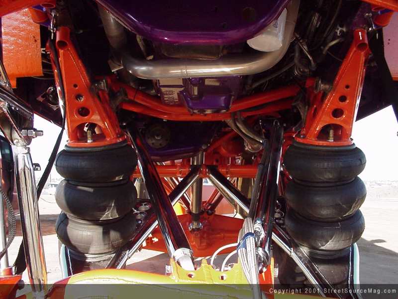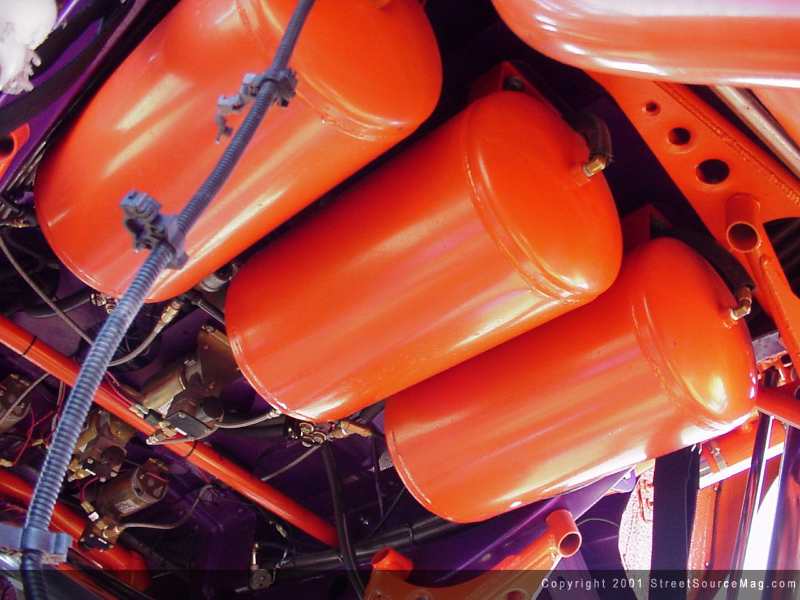 To provide the lift, four large, heavy-duty compressors were installed to fill the three two gallon air tanks. To assure quick lift, 16 EAI ½" port solenoids were installed, allowing quick release of the stored air to fill the huge air bags found beneath this huge Excursion. Helping the overall ride, 2 ½" Sway-A-Way shocks were installed, two per wheel, along with Sway-A-Way hydraulic bump stops. With a vehicle this large, you have to do whatever possible to prevent sway. Keeping this in mind, Craig's decision was easy. His choice was to install 1 ½" front and rear Sway-A-Way power bars.