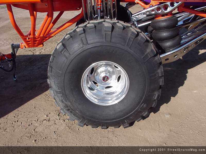As with any ride, stopping is essential. But with a beast of a machine like this, it becomes more of a must than normal. To ensure stopping and turning ability with the 16.5x14 Outback Weld racing wheels, snuggled in 44x18.5 Denman Tire Super Swampers, Craig would turn to Aeroquip for help. To help manage this task, Aeroquip steel braided brake hoses and Boyce Equipment hydraulic steering lines were installed. Keeping the clean look underneath, Jim McGill at Ranch Muffler & Truck Accessories of Temecula, California was called upon to do the plumbing for the lines. To provide a few other touches of eye candy to the undercarriage, Craig contacted the crew from Street Glow Neon. You can find purple neon throughout Craig's Excursion, along with a touch of purple neon behind the grille. Karvision's of Temecula, California provided the wiring for the neon. If you look close enough, you can also find Craig's Grover Air Horn, providing heart attacks for the elder generation. MGM also supplied a set of plexi-glass mud flaps for an added twist to this custom.