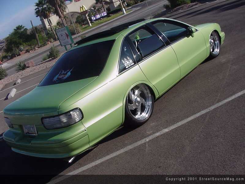 Before painting his Caprice, Jeremy decided that there was one more thing needing attention. Curing his hunger for sun, the installation of a 40x40 Britax sliding ragtop would allow the sun to shine bright throughout the interior of the Caprice. Central Paint and Body of Phoenix was responsible for all of the exterior modifications. Now truly ready for paint, Jeremy hauled the Caprice to Elite Collision of Tempe, Arizona to have Jimmy throw down his expertise. Utilizing the 2001 VW Bug sonic green paint, "The Grinch" was coming true to form.