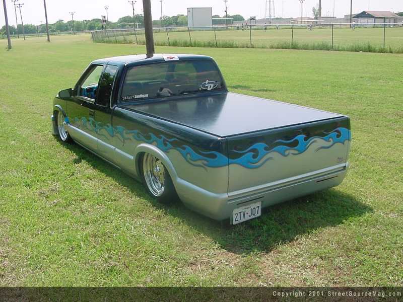 The front of the truck was coming along nicely, but something in Chris's mind told him that he needed something more to help the front-end get that "mean" look he was striving for. With that in mind, Chris covered the tacky stock bumper with a Street Scene bumper cover, complete with pilot fog lights. Now that the front-end looked clean as hell, it was time to take care of the rear-end. With help of Sean at Phat Rides, Chris cleaned up the rear of his S-10 by molding in a custom rollpan with LEDs and shaving the boring factory taillights and tailgate handle. Soon after the bodywork was complete, it was time for Chris to add some paint to his slick S-10. Needless to say, Chris wanted something that no one had ever seen before, so he handed the truck over to Max Maxwell of Maxed Out Paintwurx, Before he let Max unleash his skills of design, Chris gave his wife a chance to come up with a concept that they both would enjoy. She came up with a great idea, using tribal flames as the main concept.