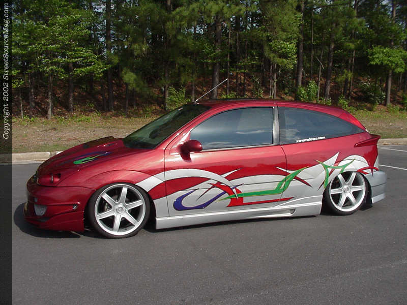 Under the hood of Howard's Focus, many things were changed to give the little four-banger much more power than stock. First, Howard ported and polished the heads of the stock engine, and replaced the internals with stronger units such as Crowler rods, JE Pistons and a new camshaft courtesy of Web cams. Howard replaced the stock underdrive pulley with a model from Esslinger and added a Ford Motosports intake manifold, as well as AEM intake. If the new mod's weren't enough, Howard also installed a 150 shot direct port nitrous system from NOS and then used a Diablo Sport Chip to allow the car's computer to utilize the new engine modifications to the max. In the rear, Howard's Focus can breathe easier thanks to 2 1/2" Borla cat-back exhaust system.