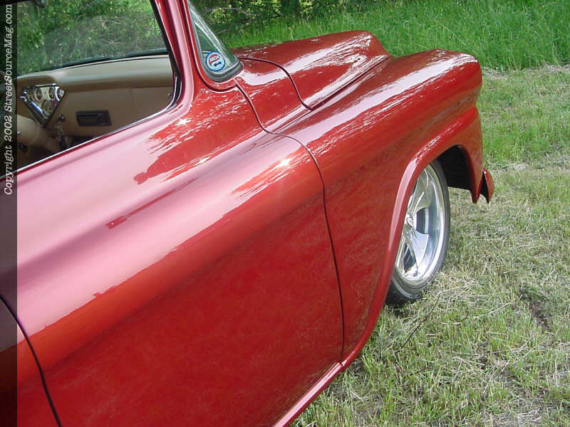 Adding to the body modifications Billy had the top of this 58' chopped 3" and custom glass installed to accommodate the chop. With the cab and fenders taken care off Billy decided to junk the factory bed and go with a 90's model step-side bed and adding to this Billy molded in a ZR-1 roll-pan, billet specialties step plates and a relocated gas neck behind the flip down license plate.  Once the bodywork was finished Billy had Legacy Paint and body of Garland Texas lay down the fire mist red paint in excellent fashion to bring this truck to life.