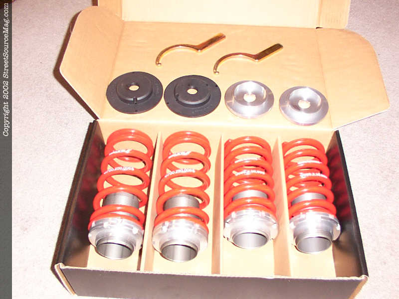 Here is what you get when you get a set of coilovers, four of each (springs, adjustable perches and spring caps) as well as a set of spanner wrenches. With the car on level ground and the emergency brake set, start with one corner at a time. Remove the center bolt from the strut tower. This releases the strut itself and leaves the top spring cap still bolted to the car. Then slowly jack up that corner. As the weight of the wheel, hub and brake assembly pulls down on the strut, it will pull the strut out of the strut tower and release the tension on the factory spring. This is where most people use a spring compressor, but if your limited on tools, this way works just as easy if not easier. Now that the top of the strut is free from the strut tower and the tension is off the spring, remove the wheel and set the car on a jack stand.