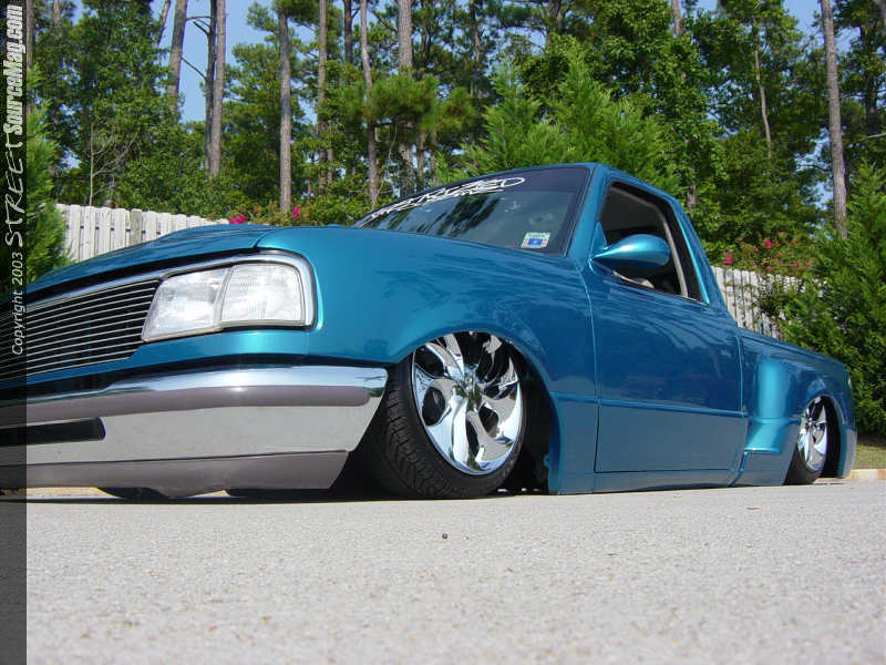The truck is a 1997 Ford Ranger Step Side standard cab. About four years ago he decided to tear it apart to build to the level you see here. After stripping the body off the frame Lil' Bubba with the help of the guys at Str8twizted Customs in Kannapolis, NC decided to do a 3.5" body drop. While the frame was just lying in the shop, they decided to do a full custom rear frame clip using 2x3 square steel.   After building the C-Notch they decided to add a custom flamed bridge,