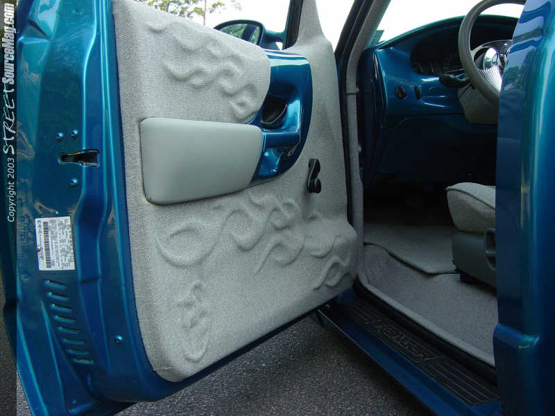 With a frame and body setting standards like that for the truck, it was necessary to have an interior that could hang with the rest of the mods. The dash along with the custom center console and parts of the door panels and stereo were smoothed and painted to match the truck.