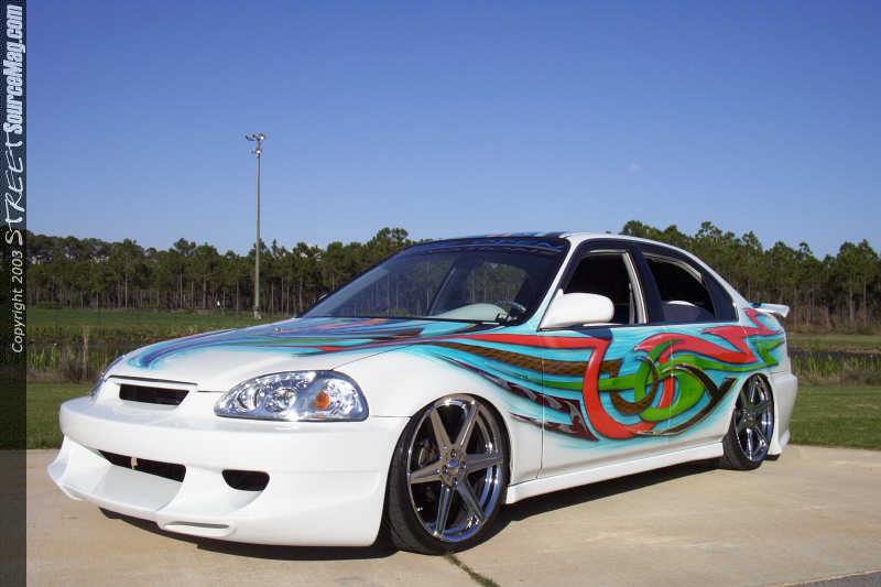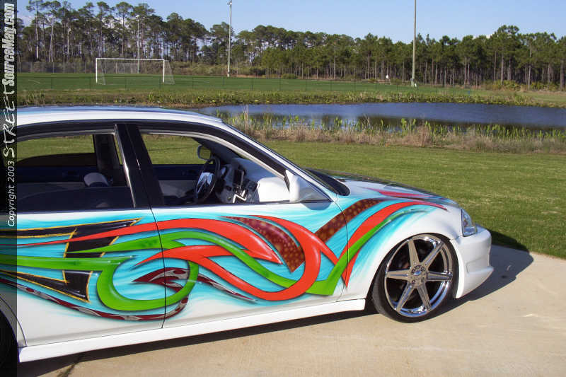 Once Allen had the Civic ready for paint he laid down numerous coats of Honda Olympic white paint to the body. Once Mitchell picked the car up from Allen he noticed that the plain white hue was not going to make the car stand out enough in the crowd so he called upon the artistic styles of William Boswell at Wild Airbrush in Columbus, GA to lay down the multi-colored airbrush theme over the entire body of the Civic.