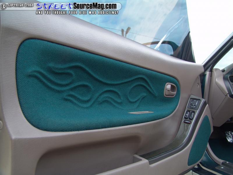 Speaking of the interior, it was all stripped out to make room for the beige leather and green tweed. Some of the tweed work has raised flame graphics for a few extra show points.   The ugly stock steering wheel was scrapped for a full billet half tribal wheel. The dash was treated to a full carbon fiber kit with an aluminum gauge bezel. Tony Plummer at Unique Interiors in Bristol, Tennessee did the seats and other stitch work.